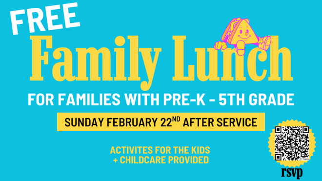 Families with kids Pre-K to 5th Grade! Join us for a FREE lunch after service on Sunday, February 22, 2026! We'll have some volunteers available to help with the kiddos so they...